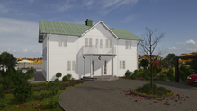 Byggnaden vilar i en klassisk volym med tydlig symmetri och ett uttryck som hämtar inspiration från skärgårdens tidlösa villor. Den gröna plåten, de ljusa träfasaderna och de välavvägda proportionerna ger huset en självklar närvaro i landskapet, samtidigt som detaljerna är nedtonade och precisa.