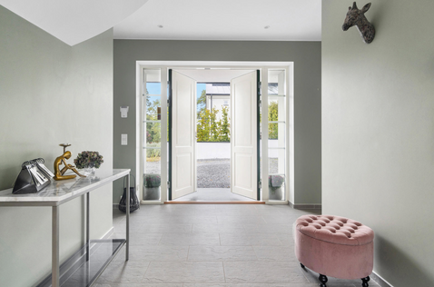 Villa Lindängen är en villa som med sin tydliga, fyrkantiga form skiljer sig från våra mer organiska hus. Husets raka linjer och rena volym skapar en stark och självklar arkitektur där fasaden i ljus puts möter inslag av natursten och trä, vilket ger byggnaden både modern karaktär och en varm, tidlös känsla.